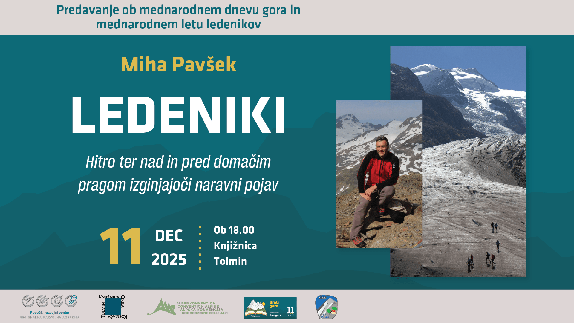Pridružite se nam na predavanju Mihe Pavška, podnebnega geografa in raziskovalca z ZRC SAZU, ki bo razkril, kako se spreminjajo Alpe in zakaj smo morda zadnja generacija, ki še lahko občuduje prave ledenike.